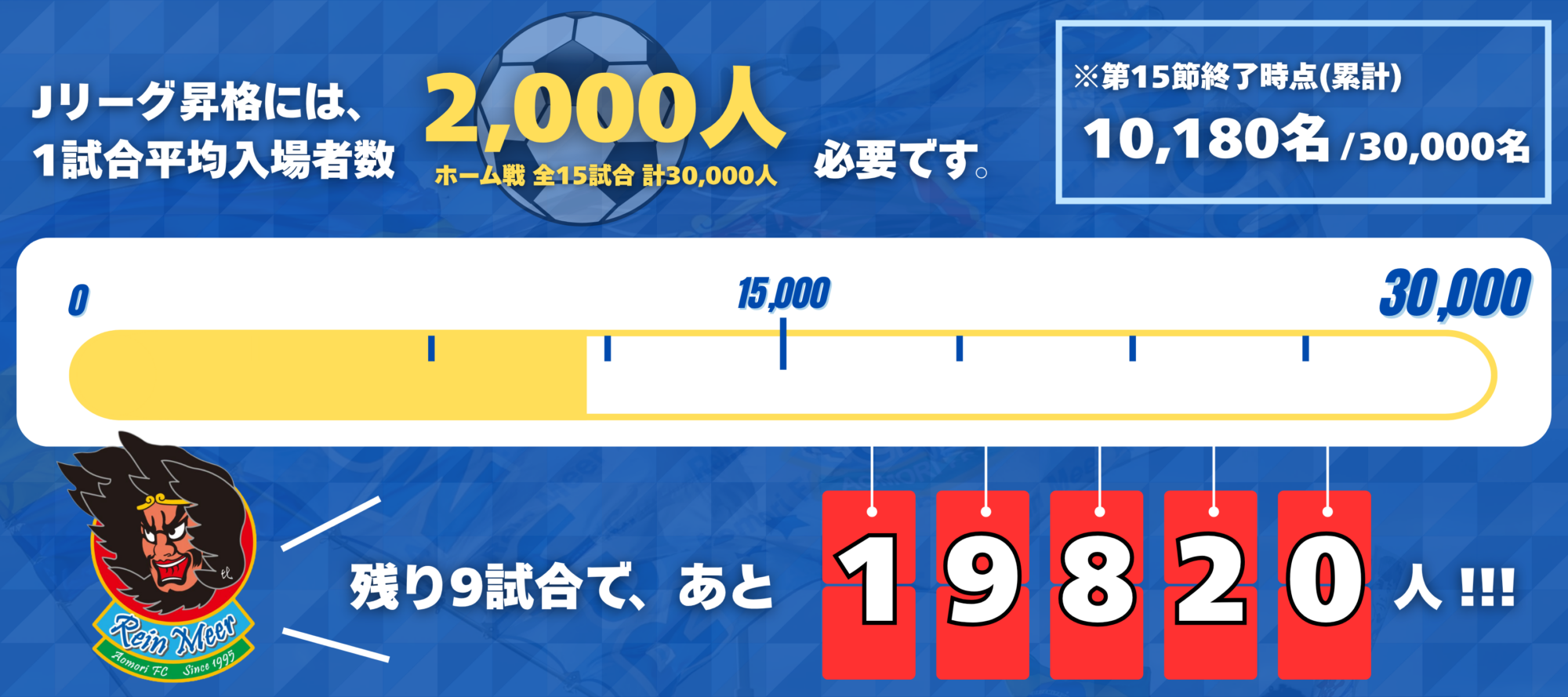 「1試合平均観客動員数2,000人」ホーム15試合で合計30,000人 の観客動員数が必要です。