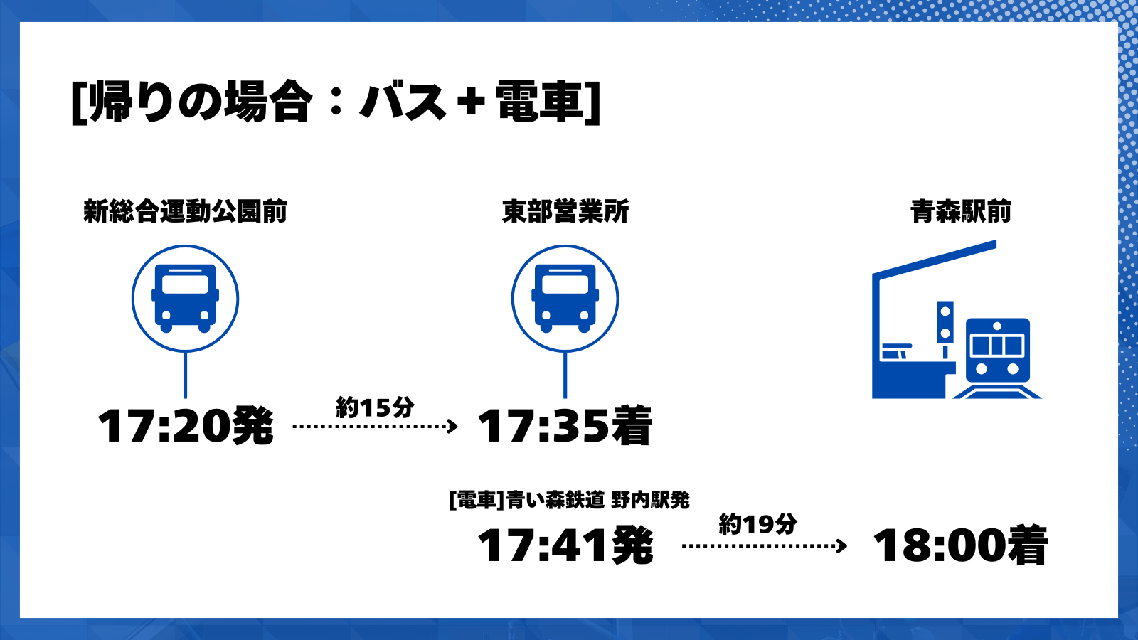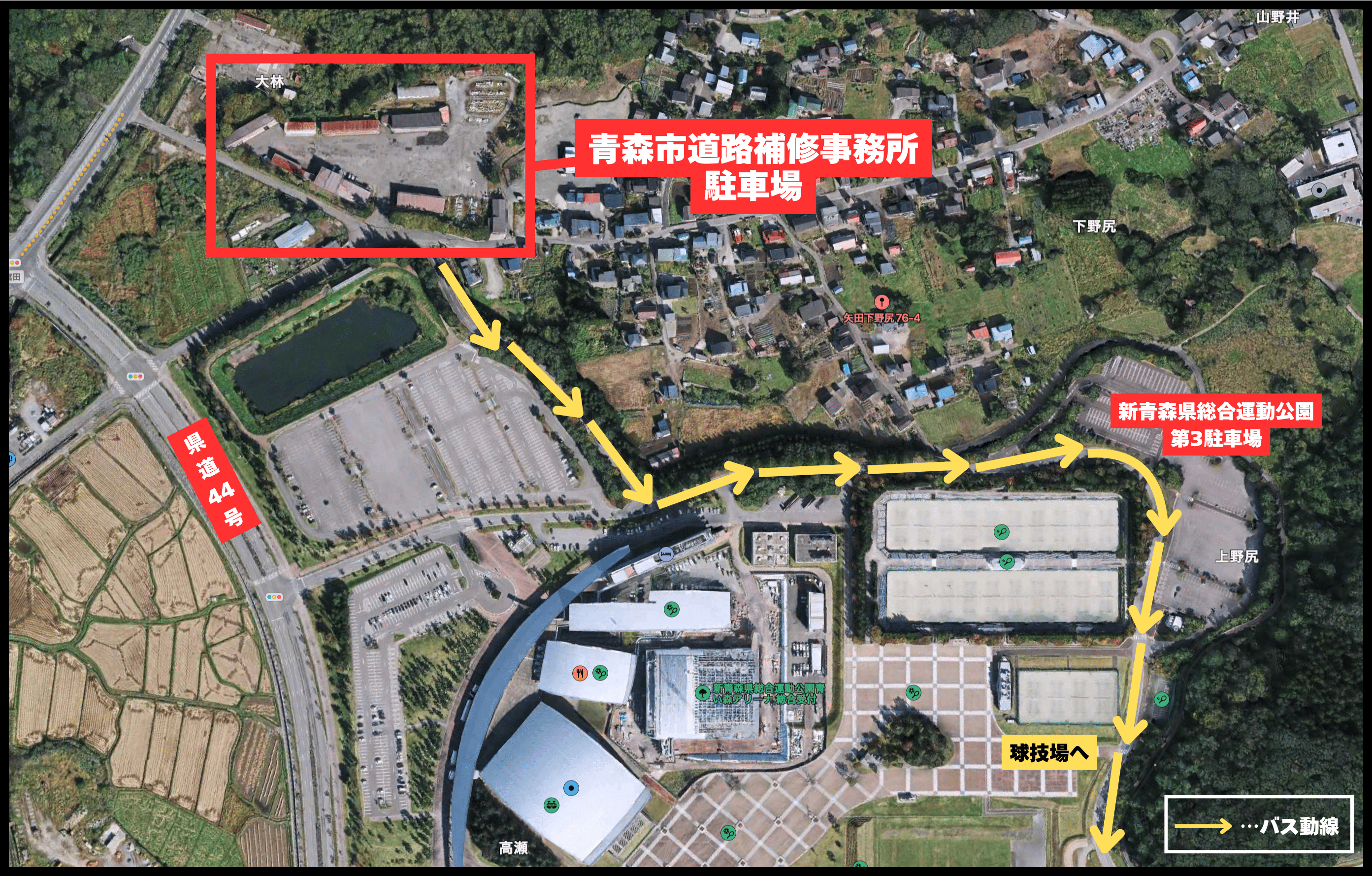 そのため今節は、青森市道路補修事務所駐車場(〒039-3503 青森県青森市矢田下野尻1)を解放いただき、シャトルバスの発着場所といたします。下記に掲載している地図をご確認ください。