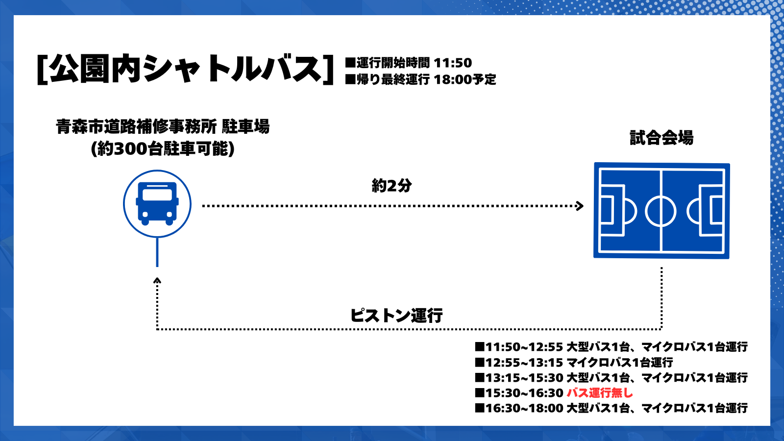 11:50より、青森市道路補修事務所駐車場~球技場の区間において、シャトルバスを運行いたします。