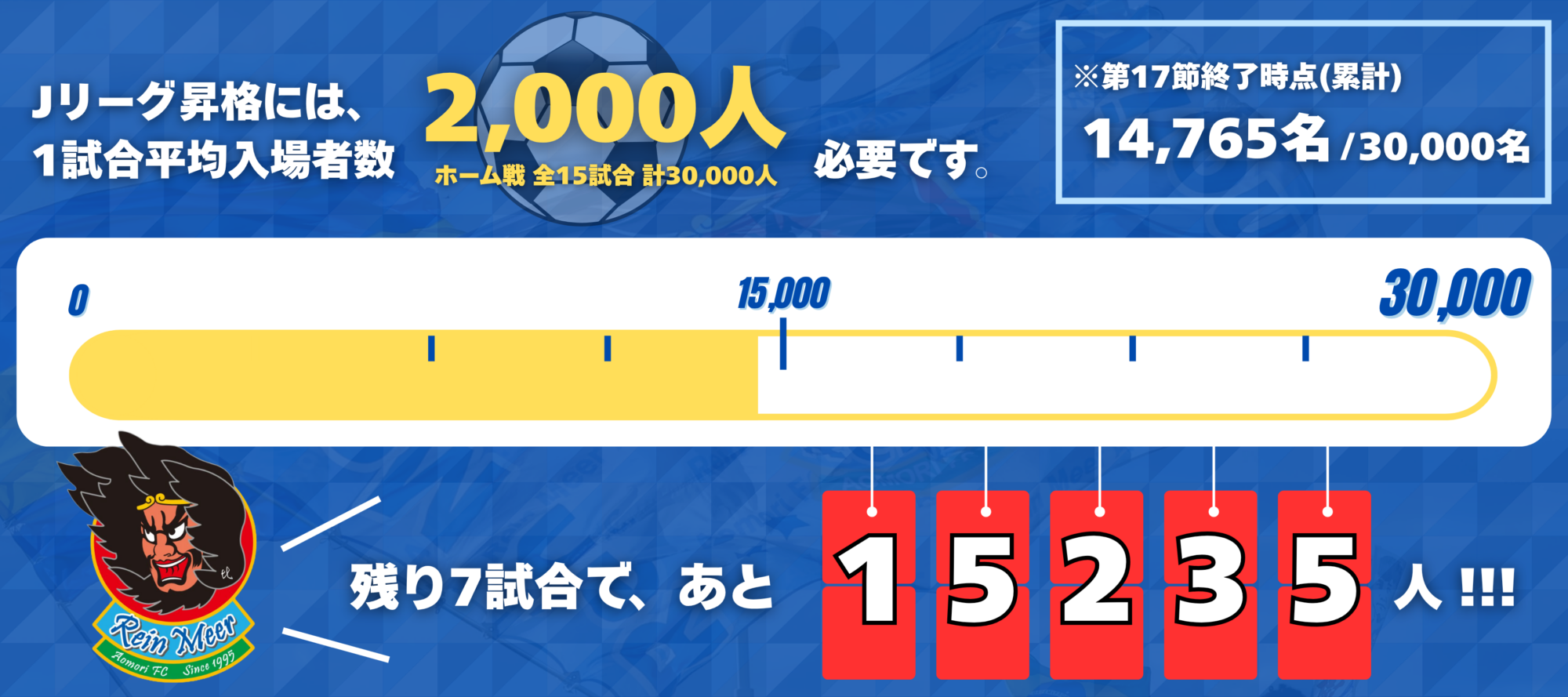 「1試合平均観客動員数2,000人」ホーム15試合で合計30,000人 の観客動員数が必要です。