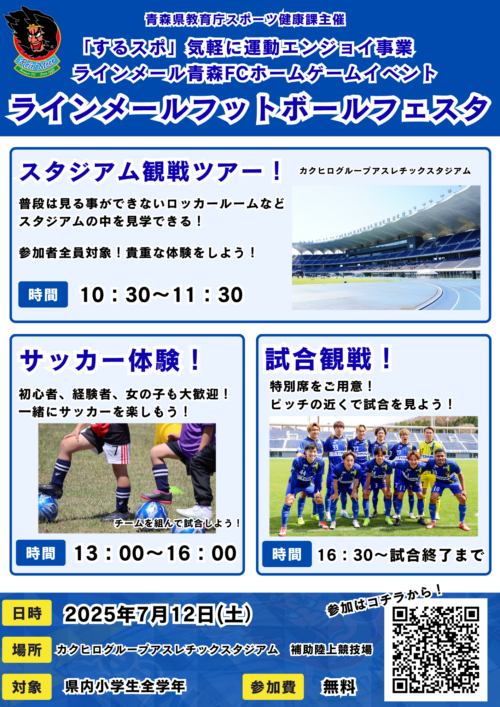 この度、7月12日(土)青森県教育庁スポーツ健康課主催「するスポ~気軽に運動エンジョイ事業~」として、スポーツに参加して・体験して・観戦するイベントを開催いたします。ラインメール青森FCの選手が試合をするスタジアムの見学ツアーや、試合観戦を通じて、子ども達がスポーツを体験できるチャンスです!