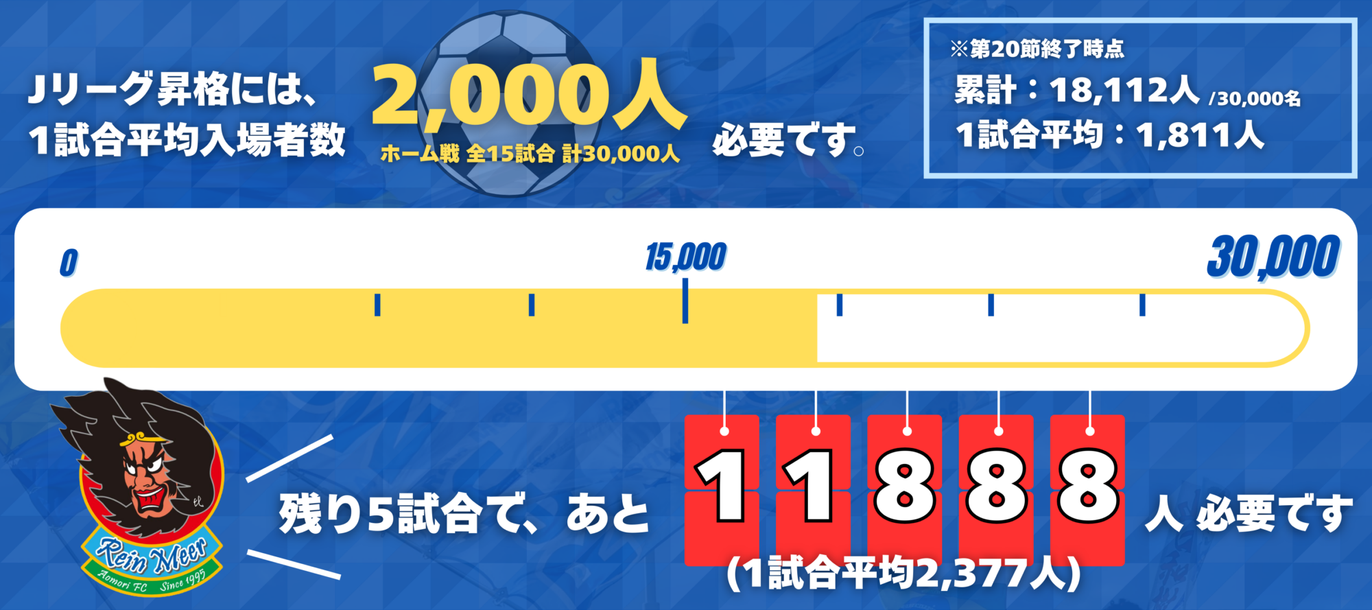 「1試合平均観客動員数2,000人」ホーム15試合で合計30,000人 の観客動員数が必要です。
