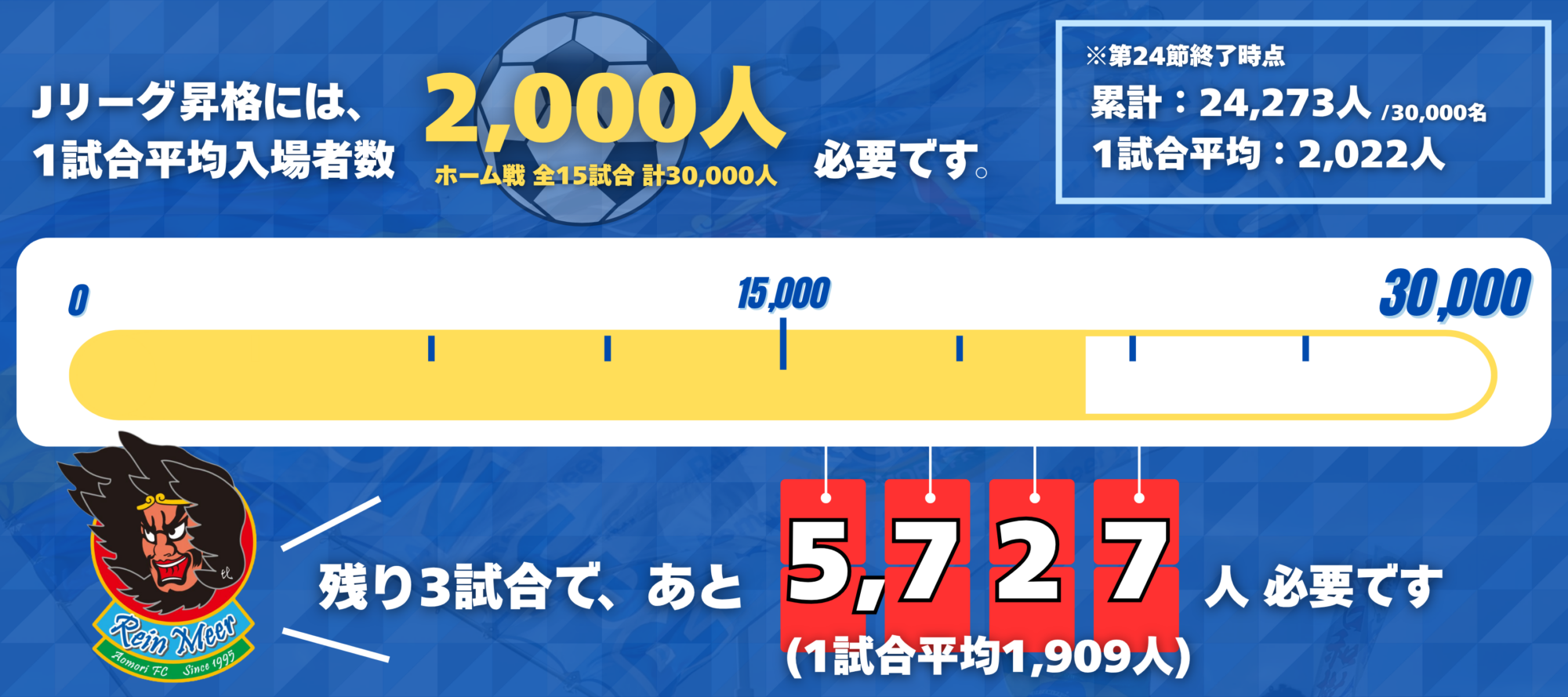 「1試合平均観客動員数2,000人」ホーム15試合で合計30,000人 の観客動員数が必要です。