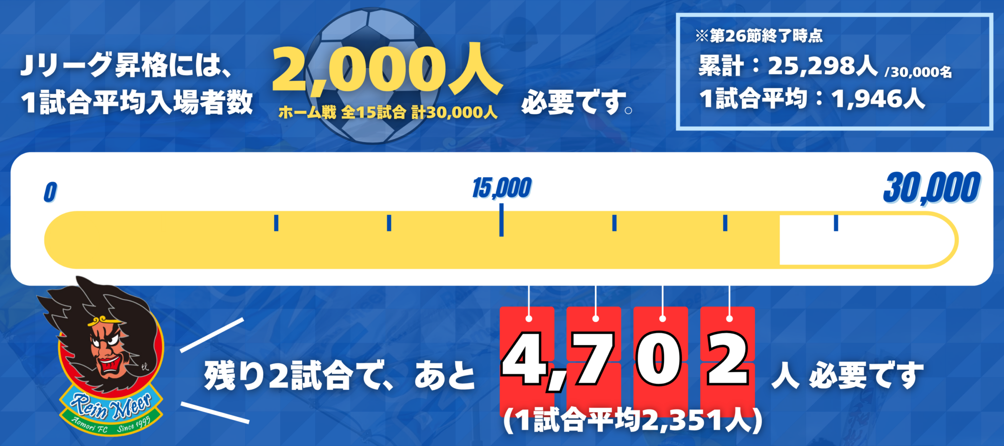 「1試合平均観客動員数2,000人」ホーム15試合で合計30,000人 の観客動員数が必要です。