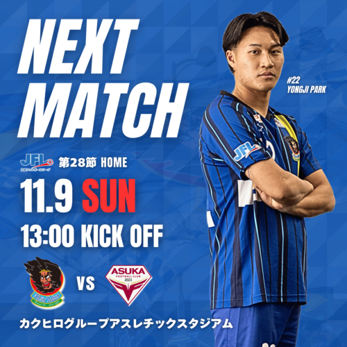 11月9日(日)に開催されます第27回日本フットボールリーグ第28節 vs 飛鳥FC の開催にあたり、ご来場いただく皆様への試合情報について、お知らせいたします。