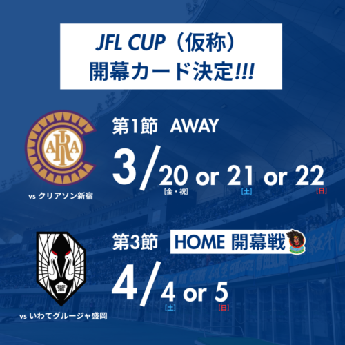 この度、JFL CUP(仮称)の第1節、第2節及びホーム開幕戦の日時と対戦カードをご案内させていただきます。